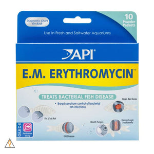 APIĀ® E.M. ERYTHROMYCIN fish remedy helps broad spectrum treatment and control of bacterial disease, such as body slime, mouth fungus, Furunculosis (open lesions and swelling), bacterial gill disease and hemorrhagic septicemia (blood spots without sign of skin damage). For use in both freshwater and saltwater aquariums. Can be used with any API Ich, fungus or parasite remedy to help prevent secondary bacterial infection. This fish remedy will not color the aquarium water.