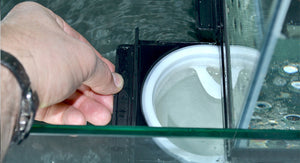 The custom mounting system attaches firmly onto the rear wall of the tank and can be rotated to the upright position during reefscaping or other tank maintenance.