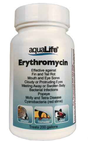 Effective against: -Fin and Tail Rot -Mouth and Eye Sores -Cloudy or Protruding Eyes -Wasting Away or Swollen Belly -Bacterial Infections -Popeye -Molly and Tetra Disease -Cyanobacteria (red slime) -For Ornamental Fish Use Only -Not For Human Consumption - use only as directed. Erythromycin is a bacteriostatic antibiotic whose activity is directed mainly against gram positive bacteria. In other words, it prevents bacteria from reproducing as opposed to killing it directly. However, it has demonstrated activity against gram negative bacteria. First, dose with AquaLife Complete Water Conditioner. Add 1/4 teaspoon per 20 gallons. Repeat in 24 hours. It is suggested that a partial water change be made between treatments. Duration of treatment depends on the type and severity of the infection. It is recommended that extended baths in this medication continue for a minimum period of 5 days and not more than 10. Discontinue if improvement is not visible within 5 days. Note: Erythromycin may cause adverse reactions when used with other medications. Wait several days after using Erythromycin before using other medications. Antibiotics and treatments are always safest when used in a hospital tank. Monitor ammonia and nitrite and use AquaLife Complete Water Conditioner. Change water as needed. Not for fish used for human consumption. Warnings: Can cause moderate eye irritation. Avoid contact with eyes, skin, and clothing. Wash hands with soap and water after contact. Keep away from heat and bright light. It is a violation of Federal law to use this product in a manner inconsistent with its labeling. Keep Out of Reach of Children Please note. Medications may not be returned for safety reasons. Medications are packed by weight with laboratory grade scales for the proper dosage stated. They are intentionally packaged in larger bottles to help prevent spilling and dust when measuring scoops are used in them.