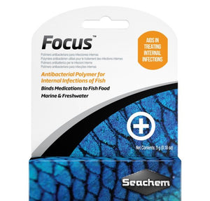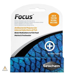 Focus is an antibacterial polymer for internal infections of fish. Focus is primarily intended to be mixed with food and/or other medications to make them palatable to fish and greatly reduce the loss of medication to the water through diffusion. This is ideal for situations where fish may show symptoms but cannot be caught and removed from the display, as it allows for targeted treatment without affecting the entire water column with broadcast medication. This can be especially important if there are decorative invertebrates in the display, as they can be particularly sensitive to many medications.