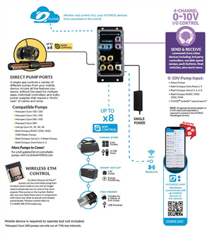 Many popular pumps from brands like Tunze, Abyzz, and Reef Octopus have external controllers equipped with a 0-10V port that allows them to be connected to a third-party controller. You’ll just need a HYDROS 0-10v quad adapter to plug in your pump and voilà! You can now take advantage of all the native flow modes and presets the pump offers without any complicated programming.