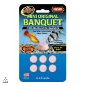 Zoo Med’s Original Banquet® time release feeding blocks last 3 to 14 days, depending on block size. In addition to weekend and vacation feeding, Original Banquet® is a great daily food source for problem feeders such as Plecostomus, Algae Eaters, Redtail Sharks, Gouramis, Saltwater Tangs, Angels & Damsels. Original Banquet® blocks are also very useful for small fry which do best when constantly feeding.