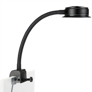 The heat sink is 2.9" in diameter, with a 3.45" diameter light shield. The light is 1.25" tall and has a 10" long gooseneck mount.